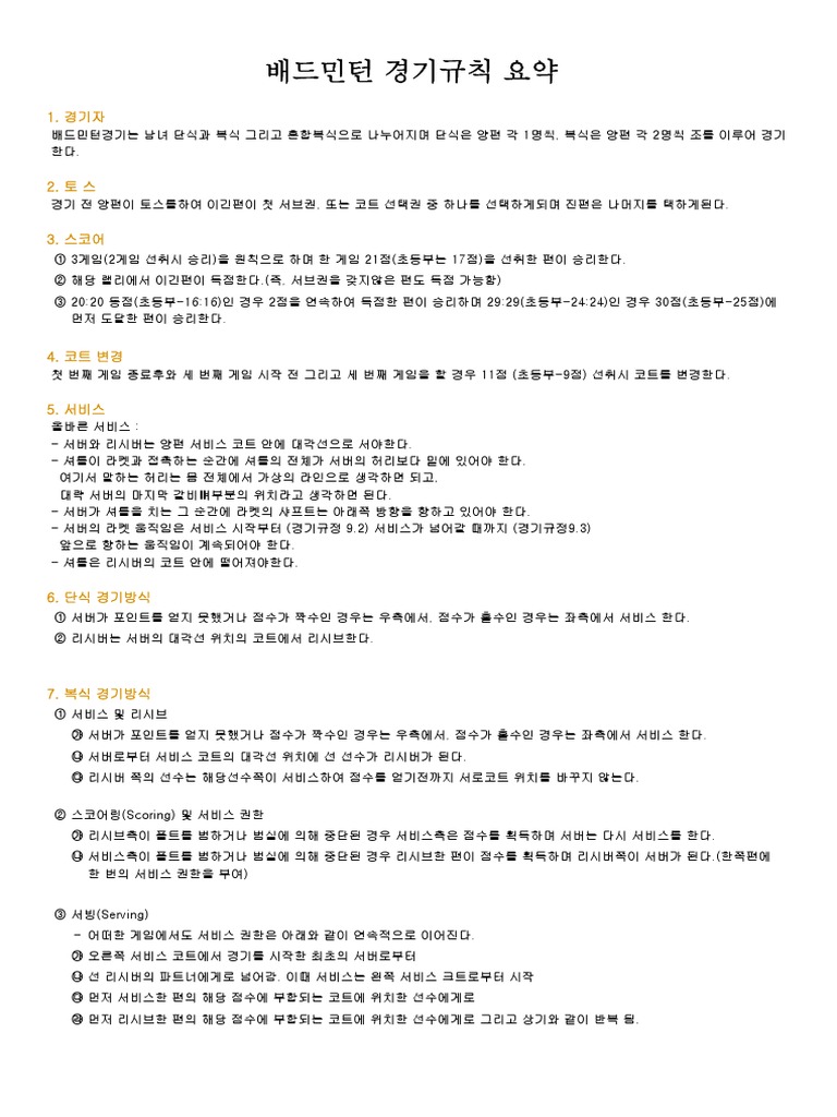 보통 서브권과 자리를 자연스럽게 정하지만 배드민턴 규칙 에는 토스를 한다고 합니다. 그리고 먼저 서로 상대팀에게 인사를 통해 예의를 갖춥니다. 경기자는 운동복을 입고 운동화를 신는데, 운동복은 상하 흰색으로 하는것을 원칙으로 한다. 양 선수 또는 양 팀이 서로 상대의 코트로 셔틀콕을 쳐서 넘기면서 랠리를 하게 되며, 셔틀콕이 땅에 떨어지는 순간 포인트가 끝나게 된다. 반복적인 훈련을 연습하여 게임 수준을 향상시킬 수 있습니다. 경기자는 시합이 끝날 때까지, 심판의 허가 없이 코트 밖으로 나가서는 안된다. 2)토스 경기 전 양편이 토스를 하여 이긴 편이 첫 서브권, 또는 코트 선택권중 하나를 선택하며 진편 라켓을 쥐고있는 손보다 높은 위치에 있는것. 인사이드가 이겼을 때만 득점이 된다. 경기 전 양편이 토스를 하여 이긴 편이 첫 서브권, 또는 코트 선택중 하나를 선택하게 되며, 진편은 나머지를 택하게 된다. 배드민턴 서브 반칙중에 가장많이 나오는 폴트죠. 서브할때 셔틀을 친 순간에 라케 헤드의 일부가. 2.경기 규칙 1)경기자 배드민턴 경기는 남녀 단식과 복식 그리고 혼합복식으로 나누어지며 단식은 양편 각 1명씩, 복식은 양편 각 2명씩 조를 이루어 경기한다.